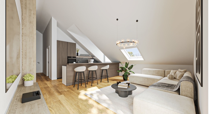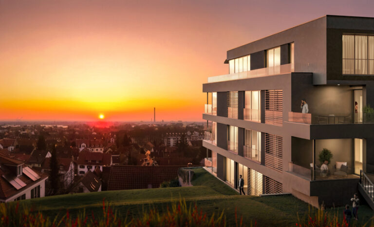 Mit seinem Farbkonzept fügt sich das offen gestaltete Mehrfamilienhaus harmonisch in die Umgebung ein und sorgt für eine behagliche Wohnatmosphäre. Das Architektenhaus besticht zudem mit seinem besonderen Mix aus Satteldach und Gauben.